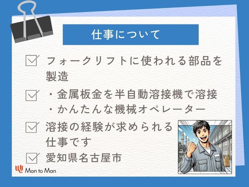 仕事内容: 【職種】 (シニアOK)産業車両小物部品の溶接 【仕事内容】 \日勤のみでのお仕事です/ \溶接の経験が求められるお仕事です/ 【 給与例 】 (時給1,550円×7.67h×20日)+残業手当+ 休日出勤1日=272,582円 【 仕事内容 】 フォークリフト等、産業車両に使われる 手のひらサイズの部品を製造しています。 ①金属板金を半自動溶接機で溶接 ②簡単な機械オペレーターもお願いします ・若年層~シニア層活躍中!! =============== 是非、あなたのご応募を お待ちしております!!