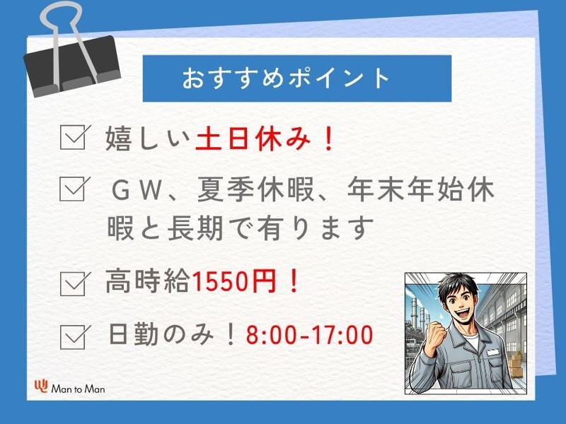 勤務時間・曜日: 【勤務時間】 【日勤】8:00-17:00(実働7時間40分) 【休憩】10時、お昼、15時の1日3回 【残業】状況に応じて発生 ※相談可能 【期間】 まずはやってみてでOKです。 生産量も安定しているため長期勤務可能です。