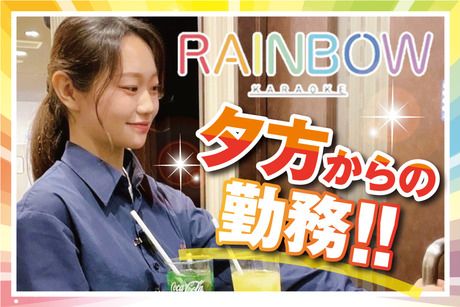 仕事内容 【カラオケ店で楽しく働こう!】 <レジ、カウンター業務> ・受付時に人数の確認や機種の説明 ・お部屋の案内 ・ドリンク、フードの注文受付 ・延長の有無の確認 <キッチン業務> ・お食事やおつまみ、デザートなどの軽食作り ・お酒などのドリンク類 <清掃業務> ・マイク、テーブル、椅子などの拭き掃除 ・食べこぼしやごみの掃除 ・おしぼりの補充 ・機器の動作確認 などお客様に快適にご利用いただけるように 店舗業務をお願いします。 【ここがポイント!】 ●<18~23時>で大募集★学校帰りにお小遣い稼ぎ!! ●シフト自己申告制◎週3日~OK!金土日のみも可! ●学生大歓迎♪学業優先シフトも相談OK! ●未経験・初バイト歓迎!サポート体制は万全◎ ●カラオケ好き必見!従業員割引あり♪ 【楽しく働きたいならレインボーで決まり!】 懐かしの曲から最新の曲まで店内には常に音楽が流れています。 「歌うのが好き」「音楽を聴くのが好き」 という方なら音楽を聴きながら楽しく働けますよ。 カラオケ店でのバイトが初めてという方も、 バイト初心者も大歓迎! 活躍中のスタッフは90%以上が未経験スタート! 丁寧なOJT研修はもちろん、 みんなが平等に覚えられるようにマニュアルもご用意! 複数人で勤務しますので、 わからないことや困ったことがあればスグに相談できる環境ですよ。