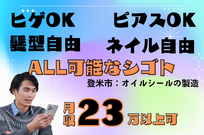 仕事内容 《 ここがポイント! 》 ○20・30・40代活躍中、女性/男性ともに活躍中 ○未経験・初心者活躍中 ○2交替・土日休み(工場カレンダー) ○髪型自由/ピアスOK/ひげOK/ネイルOK ○速払いサービスあり ○駐車場完備、車・バイク・自転車通勤OK 《 主な業務 》 自動車部品(オイルシール)の製造業務です。 ・加工機へ部品をセットし、取り外し ・完成品の外観確認(キズ・ゆがみ等) ・簡単な清掃や段取り替え など ※軽量小物中心で、負担少なめ。 《 PRポイント 》 【未経験歓迎】 先輩社員がしっかりサポートするので、 未経験からでも安心して始められます。 《 PRポイント 》 【身だしなみ自由度高め】 髪・ネイル・ピアス・ひげOKで、働きやすさ◎。 【軽作業メイン】 小さな部品が中心で、体への負担が少ないのもポイント。 【働き方の安定】 土日休み+長期休暇あり。2交替でも予定が立てやすい!