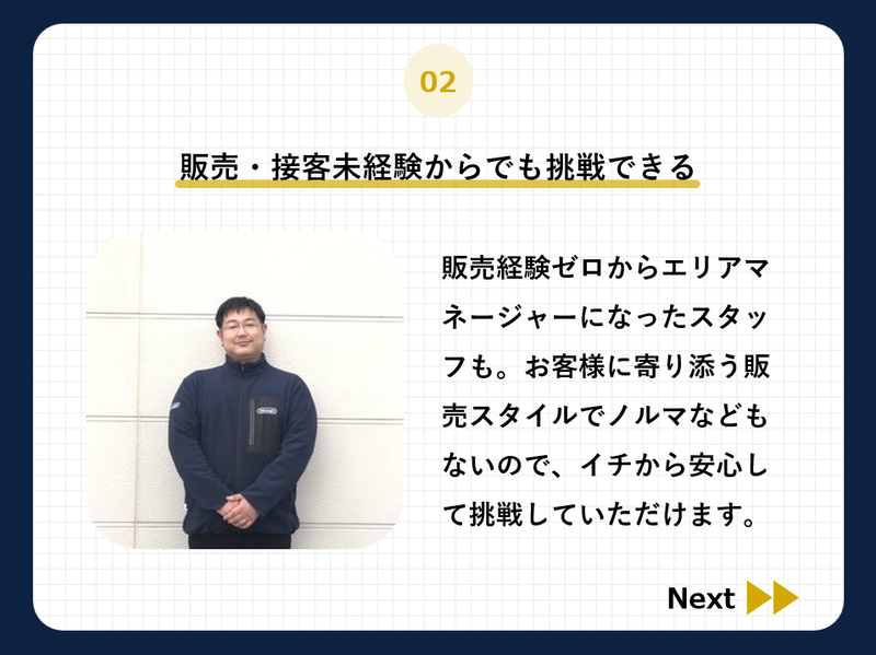 選考プロセス <応募後の流れ> 1.応募(応募時レジュメ提出で履歴書不要) ↓ 2.担当者より面接日程の調整などの ご連絡をさせて頂きます。 ↓ 3.面接実施(1回だけ) ↓ 4.内定合否のご連絡 ↓ 5.入社手続き等 ※オンライン面接も可能ですので、日程調整の際にご希望を教えてください。 ※応募前職場見学OKなので、気軽にご相談ください。 <面接でお聞きすること> ・趣味 ・過去達成感があったこと ・過去仕事で一番楽しかったこと ・応募理由 など、あなたについて雑談形式で教えてください。