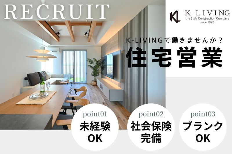 【仕事内容】 注文住宅(K-LIVING)と規格住宅(jigsaw)をスタッフと一緒に売ってくれる方を募集しています。 高性能・デザイン性・自然素材をすべて掛け合わせた注文住宅(K-LIVING)と規格住宅(jigsaw)を建てています! そのため、高性能とデザイン性、自然素材の凄さをお客様に伝えていけるスタッフ大歓迎です。 お客様と共に夢を語りながら、理想のお家に近づけるように打ち合わせを重ねてこだわりのお家に仕上げています。一生のお付き合いとしてお施主様と向き合い、一緒に夢を叶えるお手伝いをしたい方を募集します。 【主な業務内容】 ・住宅のスタイル、トータルイメージのご提案 ・図面に沿った外装・内装・水廻り・建具などのご提案 ・各種金額のご提案 ・仕様書の作成 ・ご見学希望のお客様へ展示場、完成現場のご案内 【歓迎条件】 ・宅地建物取引士 ・建築業界での業務経験がある方 ・営業経験のある方 ★時間をかけて何回もの打ち合わせを重ねたこだわりのお宅ばかりです。一生のお付き合いとしてお施主様と向き合って頂ける方を歓迎致します。 ★少数精鋭のアットホームな環境で、社員は家族のように仲良しです!詳しくは面談の際お会いした際に、当社の社風をぜひ感じてみてください。