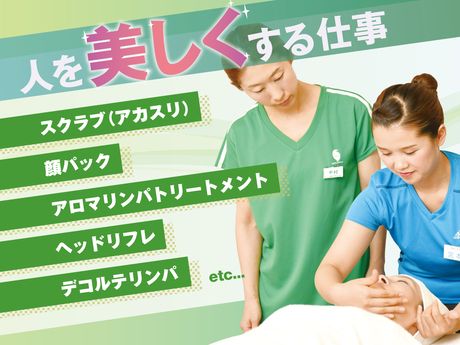 お仕事内容 ◆スクラブエステサロンでの施術・接客を担当していただきます。 具体的には… ◇予約受付/ご案内 ◇カウンセリング ◇ご要望に応じた施術 ・スクラブ(アカスリ) ・アロマリンパトリートメント ・海藻ジェルトリートメント ・フェイストリートメント ・顔ピーリング ・顔パック ・ヘッドリフレ ・デコルテリンパ *集客って結構大変じゃない?* 一般的な路面店のサロンと違い、エーワンは温浴施設内のサロン展開をしております。 そのため、お風呂に、サウナ、フィットネスなど、様々な利用されている方がお客さまになる可能性があるのです。 ですから、施設内の集客を無理にすることなく、新規のお客様が獲得することも可能です。 平日、休日問わず平均3~5名の男女問わずお客様を施術しますから、短い時間でしっかり稼ぐことも可能です♪