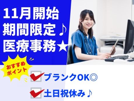 仕事内容 \ここがポイント/ ★人気の医療事務!外来受付♪ ★土日祝休みで私生活も充実◎ ★期間限定!11月~1年間の勤務 *・。・。*・。・。*・。・。* <仕事内容> \病院での外来受付のお仕事♪/ 窓口での対応や電話の取次ぎ、 会計処理などをお願いします。 ▼具体的なお仕事▼ ・外来患者さまの受付・ご案内 ・電話対応(取次ぎメイン) ・会計処理や書類の受け渡し 患者さまと接する機会も多く、 明るい対応ができる方にぴったり◎ 業務は周囲のスタッフと協力しながら、 一つずつ丁寧に進めていただきます。 ▼ここがポイント!▼ 産休代替で【11月から約1年間】の予定♪ 決まった期間で働きたい方におすすめ! また、土日祝はお休みなので 家庭やプライベートとの両立も◎ 医療事務経験がある方はもちろん、 ブランクがある方も大歓迎です! *・。・。*・。・。*・。・。*