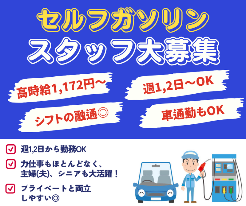 仕事内容 ─┘─┘─┘─┘─┘─┘─┘─┘─┘ ▼働きやすい理由&魅力▼ ✅セルフなので窓拭き業務などなし! ✅週1,2日〜OKで自分のペースで働ける! ✅ノルマなしで自分のペースで働ける! ─┘─┘─┘─┘─┘─┘─┘─┘─┘ ※危険物取扱者乙種4類必須 【業務内容】 セルフガソリンスタンドなので、 お客様の給油や販売ノルマなど一切ありません。 ▼ 具体的なお仕事 ▼ ・給油操作でお困りのお客様へのサポート ・店内の清掃やゴミ捨て ・備品の整理整頓などの管理業務 ・安全確認と給油許可の操作 ・その他、慣れてきたら他の業務も順次お願いします ✨経験ゼロでもこれで安心✨ 1.難しい整備や販売ノルマは一切ないので、未経験からでも始めやすい環境です。 2.最初は先輩スタッフが丁寧に教えるので安心です。 <<他にはない、ここで働く魅力✨>> 1.20代学生から60代のシニア世代が現役で活躍している職場環境です。 2.天候に左右されず快適に勤務できます。 3.週1,2日から勤務可能で、効率よく稼げます。 4.自分の時間を大切にしながら落ち着いて働けます。