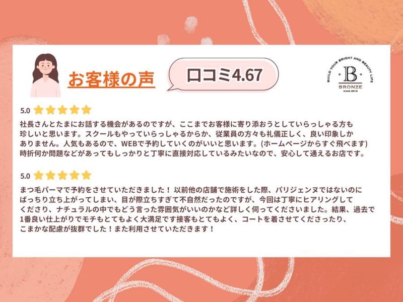 仕事内容 -アピールポイント- ✅【柔軟な働き方】 週2日~10時〜16時・15時〜19時※土曜月1回~OK ✅【シフト制で安心】 日曜は定休日・祝日相談可・年末年始相談可・ ※土曜日出勤してくださる方優遇(月1回でもOK) ✅まつげパーマ・まつげエクステ・アイブロウWAX・インクメイク など美容講習のスクール講師が在中の為、キャリアアップ技術の向上 未経験も安心です♪ ✅【駅チカ】 博多駅筑紫口から徒歩3分で便利 ✅【将来性】 将来は独立などキャリアも選べる |◤ アイリストって? ◢|  ̄ ̄ ̄ ̄ ̄ ̄ ̄ ̄ ̄ ̄ ̄ ̄ ̄ ̄ ̄ ̄ ̄ ̄ ̄ 【目元の「キレイ」を叶えるお仕事】 お客様のまつ毛に パーマやエクステをして、 目元の印象を美しく変えるお仕事です。 【お客様に自信と笑顔をプレゼント】 「目がパッチリした!」と 喜んでいただけたり、 メイクが楽になったりと、 お客様の毎日を楽しくする お手伝いができます。 【確かな技術で信頼される存在】 私たちはプロ向けの美容講習を運営しているので、 常に講師が在中しており基礎からしっかりとした技術を学べます。 |◤ お仕事内容 ◢|  ̄ ̄ ̄ ̄ ̄ ̄ ̄ ̄ ̄ ̄ ̄ ̄ ̄ ̄ ̄ ̄ ̄ ̄ ̄ ●【まつ毛の施術やサロン運営業務を担当】 ── お客様の目元を可愛くする施術がメインです。 具体的には… ⏩【業務①:施術】 └ まつ毛にカールをつけたり、 人工まつ毛をつけたりします。 まずはパーマからスタートもOKです。 ⏩【業務②:サロン内業務】 └ お客様のご案内や、 お店のお掃除などを行います。 ⏩【業務③:簡単なPC作業】 └ 予約の確認や日報入力など、 簡単なパソコン操作をお願いします。 ▶▶よくあるイメージとの違い  ̄ ̄ ̄ ̄ ̄ ̄ ̄ ̄ ̄ ̄ ̄ ̄ ̄ ̄ ̄ ̄ 黙々と作業するイメージがあるかもしれませんが、 お客様の悩みを聞く「カウンセリング」や、 似合うデザインの提案も大切な役割です。 会話を通じて信頼関係を築けるのも魅力です。 ⭐1日のスケジュール例⭐  ̄ ̄ ̄ ̄ ̄ ̄ ̄ ̄ ̄ ̄ ̄ ̄ ̄ ̄ ̄ ̄ ̄ ̄ ̄ ▼【10:00】出社・掃除・予約確認 ▼【10:30】施術(まつ毛パーマなど) ▼【13:00】お昼休憩(リフレッシュ!) ▼【14:00】施術(エクステなど) ▼【16:00】空き時間に技術レッスン ▼【19:00】片付け・退社 ※週2日~、16時~19時の勤務も歓迎! ※土曜のみ月1回の勤務など相談OKです。 ⭐キャリアアップについて⭐  ̄ ̄ ̄ ̄ ̄ ̄ ̄ ̄ ̄ ̄ ̄ ̄ ̄ ̄ ̄ ̄ ̄ ̄ ̄ ◎【無料スクールで資格・技術習得】 働きながら運営するスクールを無料で受講可能! 未経験からでもプロの技術が身につきます。 ◎【講師や独立への道も】 技術を極めて将来 自分のお店を持つ夢も応援します。 ◎【正社員登用のチャンス】 最初はアルバイト・パートから始めて、 ゆくゆくは安定した正社員を目指すことも可能です。 ⭐会社紹介⭐  ̄ ̄ ̄ ̄ ̄ ̄ ̄ ̄ ̄ ̄ ̄ ̄ ̄ ̄ ̄ ̄ ̄ ̄ ̄ 【2013年創業の実力派サロン・BRONZE】 私たちは、ただ施術をするだけでなく、 「教育」にも力を入れている会社です。 各種美容講習を開催しており生徒さんは4000人以上 現在はまつげパーマ・まつげエクステ・アイブロウ講習 タトゥーアーティスト協会 九州福岡インクメイク公認講師として活躍中 最新の美容講習と正しい技術と知識を大切にしています。 大人の女性が多く通う落ち着いたサロンで、 一流のアイリストを目指しませんか? ◯話を聞いてみたい!◯見学してみたい それでも大丈夫♪ 応募することも勇気が必要ですよね! ※どんな働き方をしたいのか? ※どんな夢があるのか? ※いろいろ不安なこともお話してください お気軽にお待ちしてます(^^) \\✨選考フロー✨//  ̄ ̄V ̄ ̄ ̄ ̄ ̄ ̄ ̄ ̄ ̄ ̄ ̄ ̄ ̄ ̄ ̄ 1.応募 (登録情報をもとに選考) 2.担当者より2営業日以内に面談・面接調整のご連絡 3.面接実施(1回) 4.5営業日以内に採用決定のご連絡 5.お仕事開始 ※最初の面接時に履歴書をご持参ください。 お会いできることを楽しみにしております。 ご応募お待ちしております。