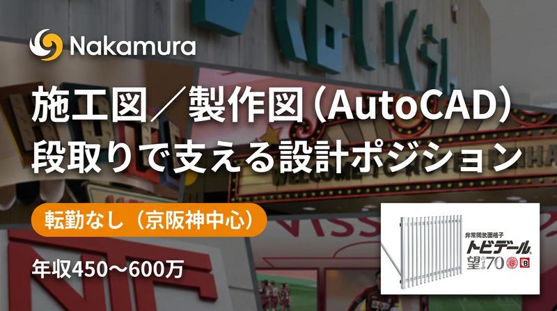 仕事内容 \オリジナル建材を支える設計・段取り業務/ □ AutoCADを用いた施工図・製作図の作成 □ 外注先への図面手配・チェック・修正指示 □ 納期調整・工程管理・社内外との調整 創業55年以上の建材メーカーで、マンション・ビル等に使用される手すり・面格子などの建築金物の設計開発業務をお任せします。 ▼簡単な募集内容▼ 【雇用形態】正社員 【給与】年収:450万円~600万円 【勤務時間】8:55~17:30(実働7時間35分) 【勤務地】兵庫県尼崎市長洲本通1-11-10 【募集要件】AutoCAD実務経験/建材・建築材料に関わった経験 ★この求人のアピールポイント★ ◇ 完全土日祝休み!年間休日125日! ◇ 残業は月10時間程度◎無理なく長期就業可能 ◇ オリジナル建材×特許製品で業績安定 ◇ 転勤なし/京阪神エリア中心 ==================== 【どんな会社?】 株式会社ナカムラは1966年創業。「安全・安心・快適生活」をキーワードに、オリジナル建材製品の開発・製造・販売を行う老舗メーカーです。 主力製品である面格子分野では国内トップシェアを誇り、マンションデベロッパー・大手ゼネコンから高い評価を獲得。防災・防火を目的とした**非常開放面格子「トビデール」**は国内外で特許を取得し、中小企業庁長官奨励賞・科学技術庁長官賞など多数の受賞実績があります。 住宅建材・建築金物・空間デザインの3事業を展開し、景気に左右されにくい安定した事業基盤が強みです。 【お仕事内容】 マンション・ビル・病院などに設置される手すり・面格子等の建築金物に関する設計業務をお任せします。 具体的には ◪ AutoCADによる施工図・製作図の作成 ◪ 外注設計・協力会社への作図依頼、図面チェック・修正指示 ◪ 営業・施工部門との連携による納期・工程調整 ◪ (必要に応じて)現場確認・施工管理要素の対応 案件ごとに寸法や納まりが異なるため、図面上での調整力が品質と工期を左右する重要なポジションです。 《入社後の流れ》 まずは製品知識(手すり・面格子等)や図面ルールを学び、先輩の案件に入りながらAutoCADでの作図・修正業務からスタート。 業務に慣れてきた後は、外注先への手配、図面チェック、納期調整など設計+段取り業務へと徐々に担当範囲を広げていきます。 【会社の魅力】 □ オリジナル建材×特許で価格競争に巻き込まれにくい □ 大手ゼネコン中心の安定した取引基盤 □ 設計~製作~施工まで一気通貫で対応可能 □ 昨年改装したばかりのきれいなオフィス 完全週休2日制・年間休日125日、残業少なめと、設計職として長く安定して働ける環境が整っています。