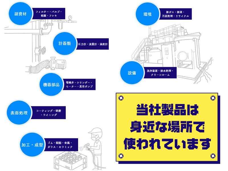 求めている人材 未経験歓迎 商品知識からしっかり教えます! 【こういった方からの応募も大歓迎】 ・法人営業の経験者 ・工業用部品製造・販売の経験者 ・商社の営業(担当or管理者)として最前線で活躍したい方 ・安定した業績の会社で長く働きたい方 ・仕事も自分の時間も大切にしたい方 ・顧客の要望に応えようと努力できる方 ・営業職にトライしてみたい方