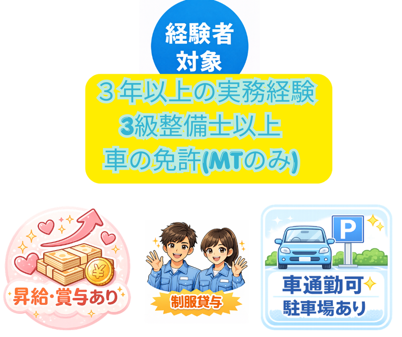 資格 【必須】 ●自動車整備の実務経験3年以上 ※これまでの経験メーカーは問いません ●3級自動車整備士以上の資格をお持ちの方 ●普通自動車免許(MT) 【歓迎】 ・1級または2級自動車整備士をお持ちの方 (こんな方も歓迎) ・ブランクがあり、現場復帰したい方 ※電気自動車やカスタム経験なしでも歓迎 ※国産メーカー、輸入車整備経験が ある方も大歓迎