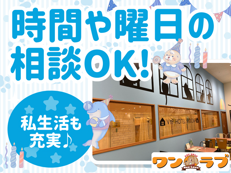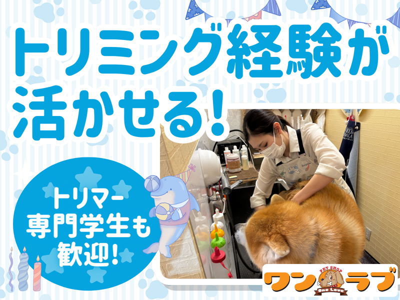 求めている人材 ✅ ワンちゃん・ネコちゃんが好きな方 ✅ トリミング経験を活かしたい方 ✅ ブランクがあっても再チャレンジしたい方 ✅ 学生で実践経験を積みたい方 ✅ 扶養内で働きたい主婦・主夫の方 ✅ 将来ペット業界でキャリアアップしたい方 私たちの職場では、実務経験者のみならず、トリマー専門学生の方も大歓迎しています! ブランクがあっても問題ありません。 また、スキマ時間を有効活用して稼ぎたい シニアの方々も応援しています。 【こんな方にもオススメ】 *授業前や授業後にバイトしたい学生の方 *副業やWワークを希望するフリーターの方 *ブランクがあってもOK *動物が好きな方 *獣医学部やトリマーを目指している学生 *将来、トリマーや動物病院スタッフ (動物病院受付、動物看護師、獣医師) として働きたい方 ワンラブでは、夢に向けた経験や知識を 得られる環境が整っています。 年齢や背景に関係なく、 皆さんの能力と経験を最大限に活かし、 一緒に素晴らしい職場環境を築いていきましょう!