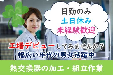 仕事内容 日勤のみ♪未経験大歓迎のお仕事です!重量物もそんなにないので安心!!男女活躍中の職場です。 <仕事内容> 熱交換器を製造している工場で、熱交換器部品の加工作業または組立作業を担当していただきます。 加工はスポット溶接など。 組立はラインではなく、機械に向かって作業する形となります。 立ち作業でのお仕事です。 個人作業となります。 《環境》 女性が多い職場です。 休憩室完備 アピールポイント <仕事内容> 熱交換器を製造している工場で、熱交換器部品の加工作業または組立作業を担当していただきます。 加工はスポット溶接など。 組立はラインではなく、機械に向かって作業する形となります。 立ち作業でのお仕事です。 個人作業となります。 《環境》 女性が多い職場です。 休憩室完備 \充実した福利厚生/ ◎社会保険・雇用保険完備 ◎有給休暇有(6ヶ月経過後、10日付与)※規定あり ◎残業手当 ◎交通費支給(規定内) ◎確定拠出年金制度 ◎週払い制度(週3回対応) ◎お友達推薦制度あり(規定有り) ※1名につき3万円~10万円臨時給与として支給 ◎車(マイカー)・バイク通勤可(駐車場月額2000円) ◎作業着貸与 ◎食事持参可 ◎休憩室利用可 ◎福利厚生プログラム (宿泊、グルメ、ショッピングなど大幅割引が受けられる10万アイテムのメニューがあります。)