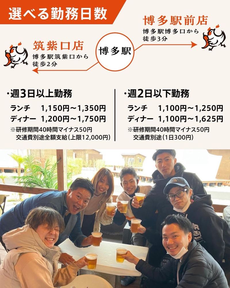 仕事内容 << オープニングスタッフ募集中 >> 2026年3月上旬 とりやき酒場 鶏ん家 博多祇園店オープン! 【華味鳥】を使ったとりやき酒場! 牛や豚を扱わないため 調理中のにおいも気になりにくい環境です♪ 【仕事内容】 お任せするのはキッチンのシンプル作業! カンタン4ステップで覚えやすい♪ ⭐下ごしらえや盛りつけの補助 ⭐仕込み済みの食材を調理機器へセット ⭐できあがった料理を仕上げ皿に盛る ⭐使用した器具の片付け まずはできるところからスタート! 慣れてきたら より本格的なキッチン作業もお任せします! 【具体的な作業】 ✨13~17時までは仕込みのお手伝い! モクモク下準備でマイペースに作業OK! ✨17時~ラストまではディナータイム! 給与もアップして効率よく稼げます★ 出来上がった料理の盛り付けのサポートや 食器や器具の後片付けを担当! 【ここがオススメPOINT!】 ✅美味しいまかない付き お腹もお財布もあたたまります★ ✅交通費支給(当社規定) 遠方からでも安心して通勤できる! ✅昇給あり(年2回査定) 頑張りはしっかり評価してくれます! ✅賞与あり(年2回) ※業績次第 嬉しい臨時ボーナスで収入アップ◎ ✅社員登用制度あり 長期で安定して働きたい方にもぴったり!