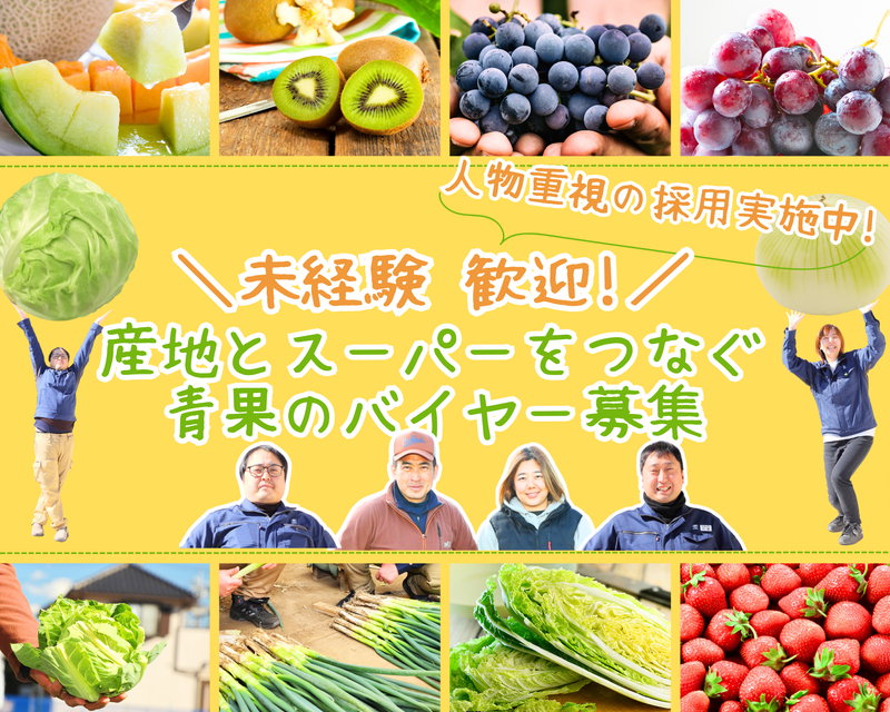求めている人材 学歴不問 / 未経験OK 【必須要件】 ・普通自動車運転免許 ・営業経験3年以上(業界不問) 野菜や果物に関する専門知識は、入社時点では必要ありません! 現在、活躍している先輩のほとんどが業界未経験からのスタートしています。 【業界未経験大歓迎♪】 前職は、建設業の営業や車のディーラーなど。営業は好きだけど、毎月のノルマのための営業を続けていくのは難しいと感じている先輩が、この業界は本当に楽しい♪と口を揃えます! 【選考のポイント】 人柄が最優先の採用となります。 面接というよりも、お互いを知るための面談のような場にしたいと考えていますので、ぜひリラックスしてお越しください☆