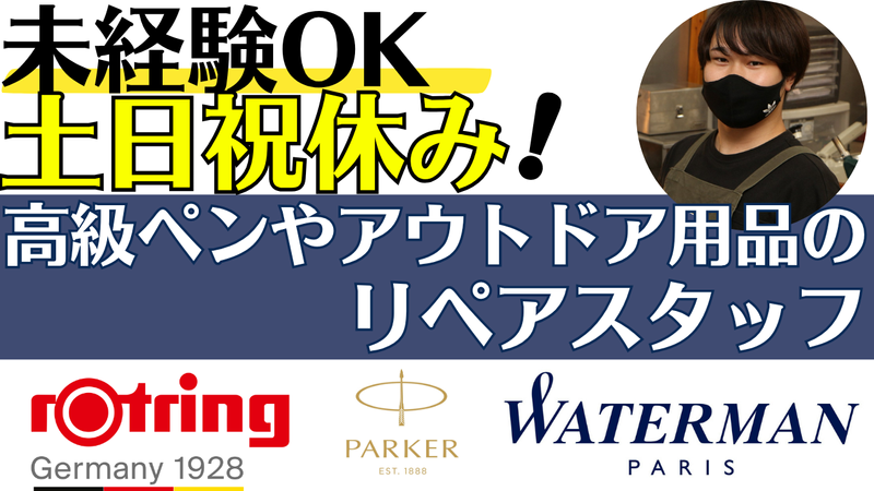 仕事内容 【土日祝休み/17:30終業】 20代~40代の男女活躍中☆* アウトドア好きな方も大歓迎♪ ╭━━━━━━━━━━━━╮ 当社のイチオシPOINT! ╰━v━━━━━━━━━━╯ ✅ フリーターさん積極採用中 ✅ 人気の土日祝休み ✅ 週4日~OK/週5日も大歓迎 ✅ 時短勤務なども相談可能 ✅ 服装自由/社員割引制度あり ✅ 地元の方中心に活躍中 *** ⋆⸜ 高級ペンの修理 ⸝⋆ 専門知識も経験も必要ありません!  ̄V ̄ ̄ ̄ ̄ ̄ ̄ ̄ ̄ ̄ ̄ ̄ ̄ ̄ ̄ ̄ ̄ ̄ ̄ 世界中で愛される高級筆記具 ― パーカー、ウォーターマン、ロットリング。 その一本一本に込められた 「想い」や「歴史」に触れ、 大切に使ってきたお客様の“想い出”を、 あなたの手で蘇らせる―― それがこのお仕事です。 修理といっても、専門知識はなくて大丈夫! 細かな作業やモノづくりが好きな方なら、 すぐに活躍できますよ* さらに、勤務先はあの【コールマン】。 アウトドアブランドならではの 自由な社風や、 キャンプ好きにはたまらないグッズにも 囲まれた職場環境も魅力です。 20代~40代の男女スタッフが活躍中! こだわりや手作業が好きな方にはピッタリ! ◤ ̄ ̄ ̄ ̄☎⋆.✩ ̄ ̄ ̄◥ お電話でのご応募も歓迎 ℡/04-7197-1555 ◣__________◢ ╭━━━━━━━━━━━━╮ こんな方にもオススメ! ╰━v━━━━━━━━━━╯ ✅ 細かい作業が好き、 手先が器用だとよく言われる ✅ コツコツ集中して取り組むのが得意 ✅ 文房具や筆記具が好き、 ついつい集めてしまう ✅ 修理や分解、組み立てなどをすることに 楽しい・やりがいを感じる ✅ 高級ブランドやクラフト系に興味がある ✅ アウトドアやキャンプが趣味 ✅ モノを大切にする気持ちを活かしたい ✅ 静かな環境で丁寧な仕事がしたい ╭━━━━━━━━━━━━╮ スタッフさんより一言! ╰━v━━━━━━━━━━╯ ▼Sさん ――― 仕事量が安定しているので 安心して働けています! 私も未経験で入社しましたが、 先輩たちがサポートしてくれたので 割とすぐ覚えることができました。 ▼Nさん ――― スタッフ同士の仲もよく、 アットホームな環境・雰囲気なので 毎日働いていて楽しいです! 職場環境や人間関係を重視し、 転職やアルバイト・パートを はじめたい方にもオススメします♬*