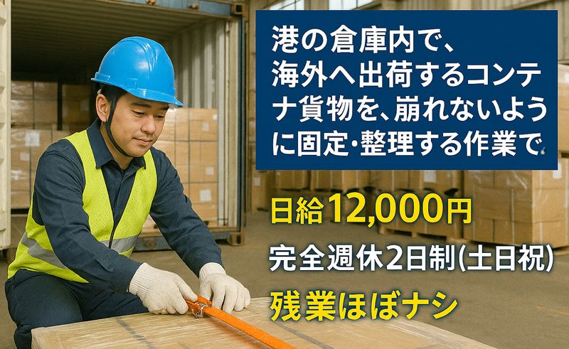 【仕事内容】 日本の物流を支える安定企業「株式会社ワークプラス」。名古屋港湾を中心に、安定した仕事の依頼がありますので、安心して長く働けます。 【ワークプラスのオススメPoint】 ・なんと、日給12,000円以上! ・昇給や年2回のボーナスもあり ・さまざまな各種手当も支給します ■具体的なお仕事内容 港の倉庫内で、海外へ出荷するコンテナ貨物を、崩れないように固定・整理する作業です。 ・フォークリフト作業員のサポート ・荷降ろし、荷直し業務 ・ベルト状の器具等を使った荷物の固定作業 ・荷物(コンテナ内)の整理整頓、簡単な位置調整 【男性スタッフ活躍中!】 体を動かして汗をかくのが好きな方に最適!体力は必要ですが、その分チームでやり切った時の達成感は大きいです! ================= 「え、最初からそんなにもらえるの?」 ================= 経験でも日給1万2,000円以上という高待遇。さらにボーナスや手当込みなら「時給2,000円クラス」。シンプル作業ですが、しっかり稼げます。 ================= 「休みってちゃんと取れるの?」 ================= もちろんです!土日祝休みの完全週休2日制、残業もほぼナシ。だから仕事終わりにジムや遊びにも行けちゃいます。 GWや年末年始は長期休暇もあり、もちろん有給級あります。プライベートを楽しみたい人にはピッタリです。