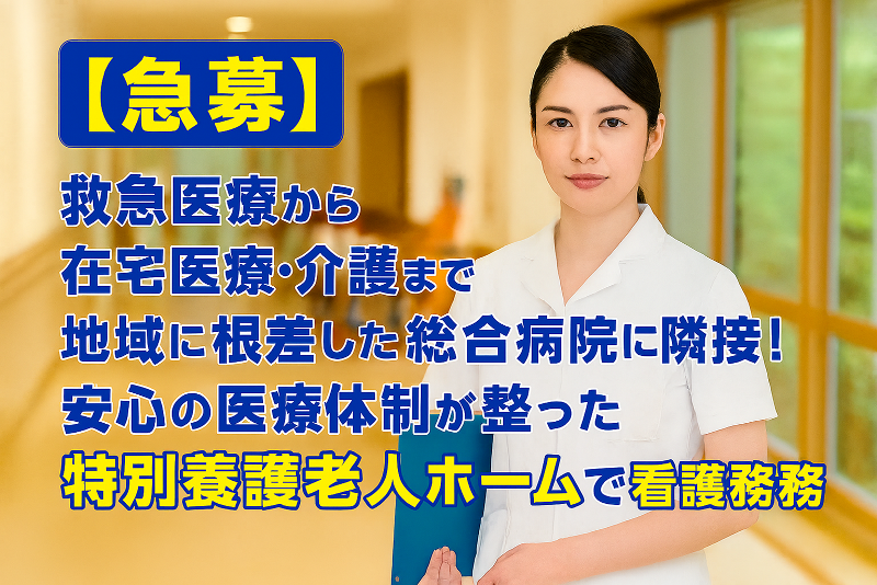 【急募!】救急医療から在宅医療・介護まで地域に根差した総合病院に隣接!安心の医療体制が整った特別養護老人ホームでの看護業務です!