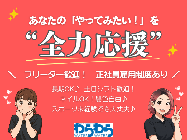 求めている人材 ⿻*.·┈┈┈┈┈┈┈┈┈┈┈⿻*.· ・人と話すことや接客が好きな方 ・明るく笑顔で対応できる方 ・ガッツリ運動は苦手でも、美容や健康には興味がある方 ・スポーツやジムの雰囲気が好きな方 ・未経験から安心してスタートしたい方 ・同世代の仲間と楽しく働きたい方 (スタッフ同士の仲の良さが自慢です) ・学校やプライベートと両立したい方 ・健康的に働きたい人♪ ⿻*.·┈┈┈┈┈┈┈┈┈┈┈⿻*.· 性別の条件と理由:女性歓迎(ポジティブアクション)