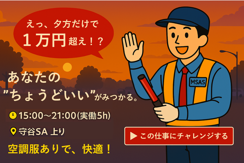 仕事内容 ✨15時スタートで無理なく高収入! 空調服ありで、夏でも快適な“夕方5時間ワーク”◎ 【こんな人にぴったり】 ✅ 授業やバイトのスキマ時間を活かしたい ✅ 真昼の暑さは避けたいけど、しっかり稼ぎたい ✅ 未経験から始められる短時間のお仕事を探している ✅ 人と関わる仕事にチャレンジしてみたい 【仕事内容】 高速道路サービスエリア内の駐車場にて、夕方〜夜の時間帯に来場されるお客様の安全サポートを行うお仕事です。 帰路につく方が多い時間帯のため、お見送り対応や最後の誘導サポートがメイン役割となります。 <おもな業務内容> ・帰宅ラッシュ時の車両・歩行者誘導 ・「通れますよ」「お疲れさまでした」などのやさしい声かけ ・夕方〜日没帯の安全確認(周囲の暗がりへの配慮や注意喚起) 暑さが落ち着く時間帯&空調服の支給ありで、夏場でも安心して働ける環境です◎ 初めての方でもチーム制&事前研修があるので、ゆっくり慣れていけます。 【勤務時間】 ・15:00〜21:00(実働5時間/休憩1時間) ・土日祝・大型連休限定の勤務スタイル ・出勤は希望申請制 ・空いた午後の時間を上手に活かせる“夕方だけ”のシフトです 【スタッフの声】 ▶ 大学生/20代男性 授業が終わってから出勤できるのがありがたい! 空調服も支給されてて、真夏の夕方でも意外と快適に動けます。 お客様に「ありがとう」って声かけられると、けっこう嬉しいです。 ▶ フリーター/20代女性 本業終わりの副業としてぴったりでした。 1日5時間でも“ちゃんと仕事した感”があるし、 仲間と協力して働けるのも安心ポイントです。