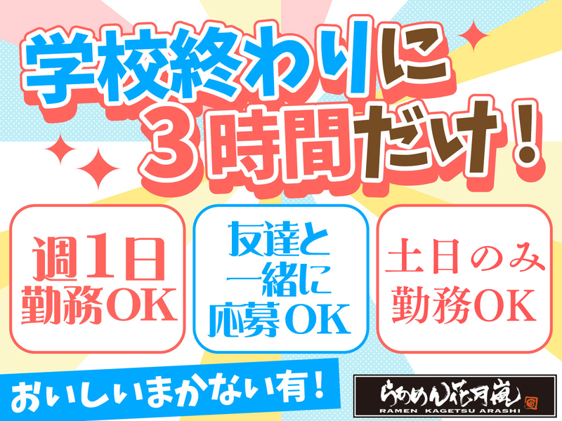 仕事内容 ✅週1日、1日3時間~OK✨ ✅学生さん、しゅふさん活躍中! ✅平日のみOK/土日のみOK ◤ お仕事内容 ◢ ラーメン店のホールスタッフ (ディナータイム)を募集します! 接客や料理の提供、 片付けなど、店舗運営に関わる お仕事全般をお任せします♪ 《 具体的には… 》 ◆接客案内 ◆料理提供 ◆片付け ◆仕込み作業 ◆調理補助 ◆盛り付けなど はじめはできることから 少しずつお任せします◎ 先輩がそばでサポートするので、 わからないことがあっても安心。 焦らず、自分のペースで 成長していけますよ! ◤ アピールポイント ◢ ⭐ やりがいたっぷり♪  ̄ ̄ ̄ ̄ ̄ ̄ ̄ ̄ ̄ ̄ ̄ ̄ ̄ ̄ ̄ ̄ ̄ ディナータイム(17時~22時30分)に 働ける学生さん・フリーターさん大歓迎! 「授業終わりにサクッと働きたい」 「Wワークで夜の時間を活かしたい」 あなたのライフスタイルに合わせて働けます◎ ⭐ 柔軟な勤務形態♪  ̄ ̄ ̄ ̄ ̄ ̄ ̄ ̄ ̄ ̄ ̄ ̄ ̄ ̄ ̄ ̄ ̄ 17:00~22:30 の間で 週1日~・1日3時間~OK! 「夕方から少しだけ」 「テスト期間はソフトを減らしたい」など テスト期間やお休みに合わせて 働ける環境です♪ ⭐ 未経験の方も安心スタート♪  ̄ ̄ ̄ ̄ ̄ ̄ ̄ ̄ ̄ ̄ ̄ ̄ ̄ ̄ ̄ ̄ ̄ マニュアル完備& 丁寧なサポートがあるので、 飲食が初めての方や、 久しぶりのお仕事復帰にもぴったり。 実際に多くのしゅふさんが活躍中で、 仲間と一緒に楽しくお仕事ができます♪ 家庭と両立しながら、 少しずつお仕事復帰したい方にぴったり◎ あなたのご応募、お待ちしています!