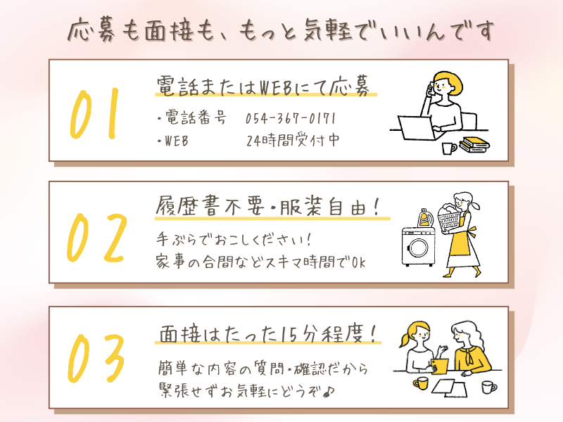 選考プロセス 〈1.応募〉 Webまたはお電話から応募。 〈2.面接〉 履歴書不要・服装自由。 15分程度の簡単な面接ですので、お気軽にご参加ください。 ご質問やご要望も遠慮なくお聞かせください。 〈3.採用〉 即日で面接結果をお知らせします。 勤務開始日はご希望にお応えします。 ※応募の秘密は厳守します。