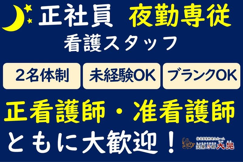 【仕事内容】 夜勤専従の常勤看護職員さん募集!併設のナーシングホームへの訪問看護になります。 ✅夜勤は2名体制で安心! ✅介護施設未経験、ブランクある方も大歓迎です! ✅年間休日125日以上!プライベートも充実! ■具体的な仕事内容 住宅型有料老人ホームでの夜勤専従のお仕事をお任せします。 ・看護業務 ・利用者様の巡回と安否確認 ・介護看護記録 ・起床時の介助やお手洗い誘導 など 先輩スタッフが一から丁寧にサポートします。 2名体制で夜勤を行うため、確認しながら業務を覚えていただくことが可能です! ■ナーシングホーム笑樂乃郷 大晃(しょうらくのさと だいこう) 大晃グループでは、介護・看護・事務すべての職種で有給休暇が「半日単位」から取得可能です。 お子さまの学校行事や急な用事にも合わせて柔軟にシフトを調整できるので、子育て中の方も安心して働けます。 また、私たちの合言葉は「助け合い・支え合い」。 スタッフ同士が自然とフォローし合える風土があり、実際に多くの子育て中のママがイキイキと活躍しています。 ■いきなりの面接は不安な方には施設見学も大歓迎です! 働き方の相談や、仕事内容のご質問などのお問合せもお気軽にご連絡ください。 入職時期が2、3ヶ月後の方も遠慮なく、施設見学承っています。先ずはメールでお問い合わせ下さい。 ✅もっと詳しく知りたい方は、「 大晃サービス 」で検索ください! 【求人ID-DKS2】