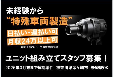 仕事内容 まずは短期で“モノづくり体験”を! 「興味はあるけど、 いきなり正社員は不安…」 そんな方にぴったりの工場ワークです。 扱うのは、 介護・福祉の現場で使われる “リフター・スロープ・回転シート” などのユニット! 人の生活を支える モノづくりに関われます。 ・。・。・。・。・。・。・。・。・。・。 ▼具体的な仕事内容▼ 電動ドライバーを使って 金属部品の組立・仕上げ・検査を行います。 ・福祉車両部品の組立・加工 ・スポット溶接の補助作業 ・仕上げ、バリ取り、梱包などの軽作業 ※未経験OK!丁寧な研修あり ※玉掛・クレーン資格者は優遇 \日払い・週払いOK/ 短期でも【月収24万円以上】可能です! ・。・。・。・。・。・。・。・。・。・。 ★こんな方におすすめ  ̄V ̄ ̄ ̄ ̄ ̄ ̄ ̄ ̄ ̄ ̄ ̄ ̄ ◇モノづくりに興味がある方 ◇工具を扱う作業が得意な方 ◇コツコツ丁寧に仕事を進めたい方 ◇人の役に立つ仕事がしたい方 ◇冷暖房完備の快適環境で働きたい方 ★勤務条件  ̄V ̄ ̄ ̄ ̄ ̄ ̄ ̄ ̄ ̄ ̄ ̄ ̄ ・期間:~2026年3月末(短期) ・時間:9:00~18:00 (実働8h/休憩1h) ・休日:土日休み (企業カレンダーに準ずる) ・時給:1,550円+交通費支給 ・勤務地:茅ヶ崎市萩園 (寒川駅より車9分) ★職場環境・魅力ポイント  ̄V ̄ ̄ ̄ ̄ ̄ ̄ ̄ ̄ ̄ ̄ ̄ ̄ ◎ 冷暖房完備の清潔な工場 ◎ チーム制で安心フォロー ◎ 未経験でも始めやすい 組立中心の仕事 ◎ 短期間で技術を学べる ================== 「手に職をつけたい」 「まずは短期で試したい」 そんなあなたを応援します。 まずは質問だけでもOK! お気軽にご応募ください♪