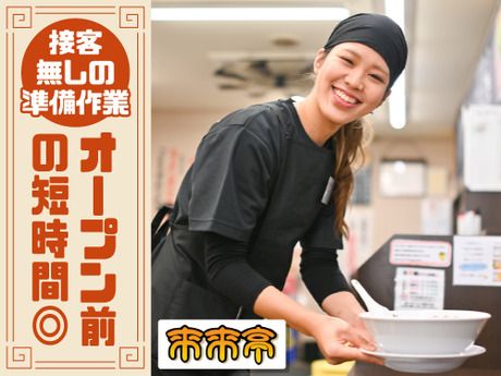仕事内容 \開店準備メインのレア募集/ 勤務は朝の3時間だけ! 「午後は自由に使いたい」「短時間だけ働きたい」方に◎ 接客なしのシンプル作業が中心です♪ ?来来亭の“いいトコロ”ご紹介♪ ・高時給スタート&昇給スピード早め! 短時間でもしっかり収入GET◎ ・食事補助あり 朝の勤務後にお得にメニューが楽しめる♪ ・スタッフ優待券あり オフの日も、友達や家族と一緒に来店OK! ・シフトの自由度◎ 朝だけの固定シフトもOK!Wワーク・副業にもぴったり♪ ☆未経験・久しぶりのお仕事復帰も歓迎! 主婦(夫)さん・早起きさん・Wワーカーさん活躍中! \来来亭は“人柄重視”/ 朝の落ち着いた時間帯で、 丁寧にフォローしてもらいながら安心スタート♪ 【具体的なお仕事内容】 ・店内清掃 ・お水や調味料の補充 ・食器などの片付け ・野菜の仕込み(カットなど) ・調理補助 簡単な事からスタート♪ 「お皿を片付けておいて」 「これと同じようにカットして」 など、一緒に作業しながら 先輩スタッフが丁寧に教えるので 未経験の方やブランク有の方も ご安心ください!