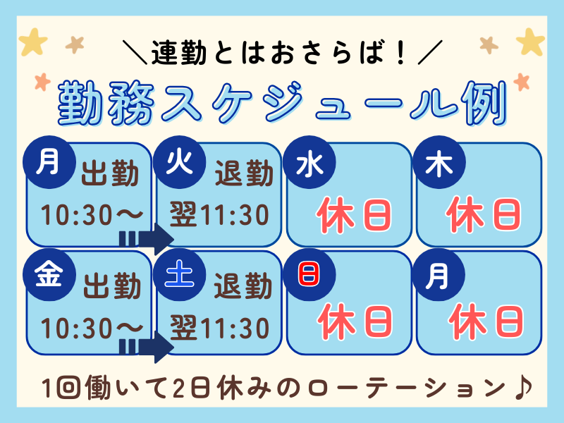勤務時間詳細 総労働時間:1ヶ月あたり150時間15分 〜 171時間 <勤務時間> 10:30~翌11:30(実働時間20時間45分) (休憩4時間15分※仮眠含む) ~1日の流れの一例~ 10:30 出勤・制服に着替える 11:00 朝礼・引継ぎ・予約数の確認など 15:00 チェックイン対応・フロント対応 24:00 仮眠・休憩 04:00 ロビー設置のアメニティ補充 06:00 朝食会場のお手伝いなど 08:00 チェックアウト対応・引継ぎ 11:30 退勤 <その他> 月1回フロントミーティングあり ▶10:00~16:00(休憩1時間) ※無料で昼食も提供されます。