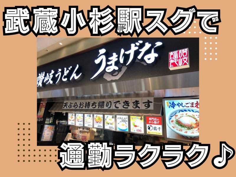 仕事内容 ◤━━━━━━━━━━━━━━━━━◥ 髪色・髪型自由!!オシャレを楽しめる♪ シフト自己申告制で働きやすい環境◎ 短時間勤務もフルタイム勤務も大歓迎★ ◣━━━━━━━━━━━━━━━━━◢ <フードコート内の讃岐うどん屋さん✨> ✅レジでのお会計業務 ✅カンタンな調理業務 ✅カウンターでの料理のお渡し…など! 配膳&下膳はナシ!厨房内で業務完結♪ うどん、天ぷら、カレー等を提供します! オシャレを楽しみながら働けますよ☆彡 ――――――――――――――――――― うまげなとは「立派な」「美しい」 「調子がいい」といった意味で 使われる香川県讃岐地方の方言。 はなまるうどん系列で、セルフスタイル。 安い!早い!おいしい!が 揃った、人気のうどん店です。 ―――――――――――――――――――