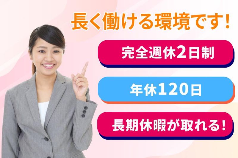 休日休暇 完全週休2日制(土日・祝) 年間休日120日(会社カレンダー) ・夏季休暇 ・年末年始休暇 ・GW休暇 ・有給休暇