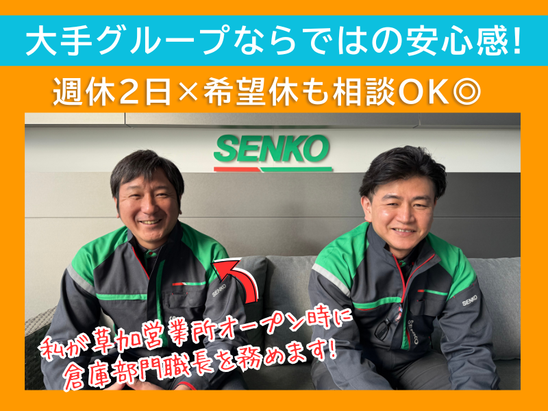アピールポイント: = = = = = = = = = = = = = = = = = = 2026年6月OPEN!草加営業所 “先行採用”だから、オープン前から働ける◎ 未経験から育てる安心環境! = = = = = = = = = = = = = = = = = = ● オープン前から研修&勤務OKで不安ゼロ 草加営業所オープン前は、浦和営業所で研修・勤務が可能。仕事の流れを覚えてから本配属できるので安心です♪ ● 待遇そのまま!月給30万円~35万円+賞与あり 研修期間→本配属後も条件変更なし。がんばりは待遇でしっかり還元します◎ ● 未経験でも大丈夫!段階的にステップアップ いきなり管理業務を任せることはありません。まずは現場作業 → 慣れたらスタッフ管理・業務改善へ。「成長したい」「上手くなりたい」向上心を応援します! ● 大手グループの安定感+福利厚生しっかり センコーグループの安定基盤あり。資格取得支援や各種制度など、長く続けやすい待遇が整っています◎ ---------------------------------------