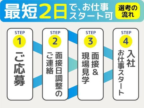 選考フロー 【ネット応募】 ・簡単な氏名や住所の入力(応募完了) ・1営業日以内に髙井から連絡し面接日の調整を行います。(WEB面接可) ※21時以降の応募は翌営業日対応 【電話応募】 9時~18時:平日のみ ※面倒な情報入力等不要で簡単応募可能♪ 【採用まで】 ・履歴書不要+私服でOK! ・WEB面接、出張面接も対応します◎ ・簡単に職歴などを質問します◎ 志望理由も「時給が高いから」等で大丈夫です。 ・採用通知はその場か最低でも2営業日以内にご連絡します。 ・面接日・入社日はご相談に応じます。