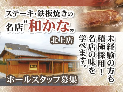 仕事内容 \未経験から安心スタート/ 地元で愛される老舗レストラン「和かな」にて ホールスタッフを募集いたします。 未経験の方も安心して働ける環境です。 最初はホール業務の基本からスタートし、 先輩スタッフが接客マナーや飲食業の基礎を丁寧に指導します。 資格や経験は必要ありません。 やる気と前向きな姿勢があれば、どなたでも安心して挑戦できます。 「主なお仕事内容」 〇お客様のご案内(予約やご希望を確認し席へご案内) 〇注文の確認(オーダーを伺いキッチンへ伝達) 〇料理・飲み物の提供(最適なタイミングでテーブルへお届け) 〇テーブルの片付けや清掃、会計業務、予約対応 「和かな北上店」は昭和35年創業の老舗レストランで、 地元の方はもちろん観光で訪れるお客様にも長く愛されています。 「ありがとう」「また来ます」といったお客様の声がやりがいとなり、 毎日の接客を楽しく感じられる職場です。 経験を積めば、将来的に調理や鉄板焼き業務へのステップアップも可能です。 「こんな方におすすめです」 ・飲食業界に興味があり、未経験から挑戦したい方 ・人と接することが好きな方 ・チームで協力しながら働くことが得意な方 ・安定した老舗レストランで長く働きたい方 「最後に」 「和かな北上店」では、一人ひとりの成長を全力でサポートしています。 未経験からの挑戦も、経験を活かしたい方も大歓迎です。 私たちと一緒に、お客様に「幸せを感じられる料理」を届けませんか。 皆さまのご応募をお待ちしています。