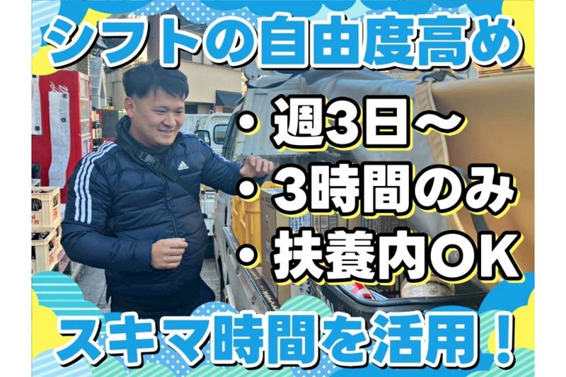 アピールポイント: 【未経験でも安心!】 多くの先輩が未経験スタートなので 初めての方もリラックスして働けます! お届け先は顔なじみの常連さんばかり◎ まずは笑顔で「こんにちは!」と 声をかけることからスタート! 先輩がしっかりサポートするので 不安なときは何でも頼ってくださいね★ 【シフトの自由度抜群!】 1日たったの3時間の勤務でOK◎ 週3日から勤務できるので プライベートの時間もしっかり確保。 シフト希望の相談も 柔軟に受け付けています! 短時間で集中して働きたい方に ぴったりの環境です☆ まずはご希望の働き方をご相談ください♪