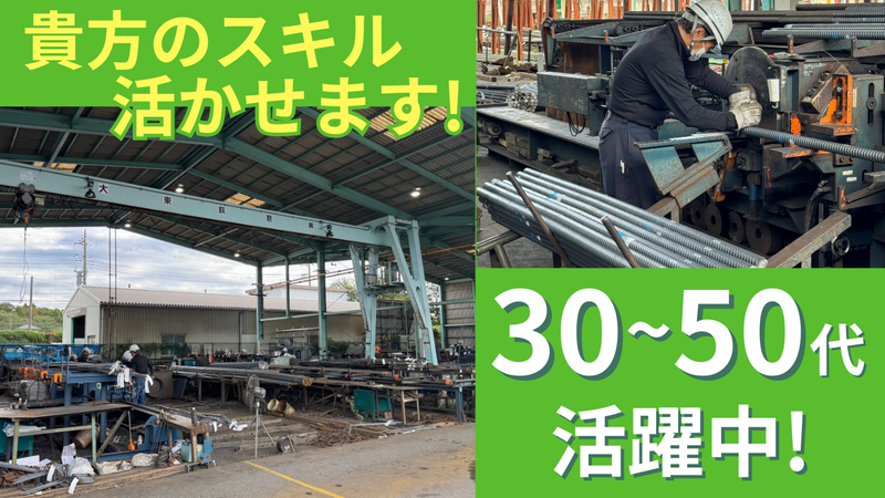 仕事内容 ◤創業70年以上!業績は年々UP◎◢ マンション・オフィスビル・病院など様々な施設で使われる「鉄筋工事全般」を行う安定企業です。 大手ゼネコンと直接取引を行っており、業績は年々右肩上がりで安定性抜群! 会社の利益は、頑張ってくれているスタッフのため、職場環境の改善などでしっかり還元しています。 大小さまざまな鉄筋の加工を請け持ち、高い需要を持つ当社。 鉄筋工事の現場経験を活かし、 さらに専門性の高い管理業務へステップアップできる環境です。 \職場環境・待遇について/ ✅有給取得率90%超! ✅各種手当で収入UPも可能 ✅直行直帰OK ✅現場管理中心の業務 ✅大手ゼネコンとの安定取引あり ✅創業70年以上の安定企業 - 【具体的な仕事内容】 鉄筋工事に関わる現場管理業務をお任せします。 ・工事現場での打ち合わせ ・配筋検査の立ち会い ・工程・進捗の確認 ・安全管理、品質管理 など 配筋検査とは コンクリートを流し込む前に、 建物の骨組みとなる鉄筋が図面通りに 正しく配筋されているかを確認する作業です。 建物の構造上の安全性・耐震性・耐久性を 確保するための、非常に重要な工程となります。 ※現場へは直行直帰OK! ※鉄筋工事・施工管理など経験者は優遇します。 - 鉄筋一筋、70年以上。 設立当初から現代まで引き継がれる技術が評価され、多くの施設に私たちがつくった鉄筋が利用されています。 これからも業績を伸ばし、安心して腰を据えて働けるよう社員の生活基盤も支えていきます。