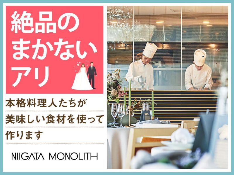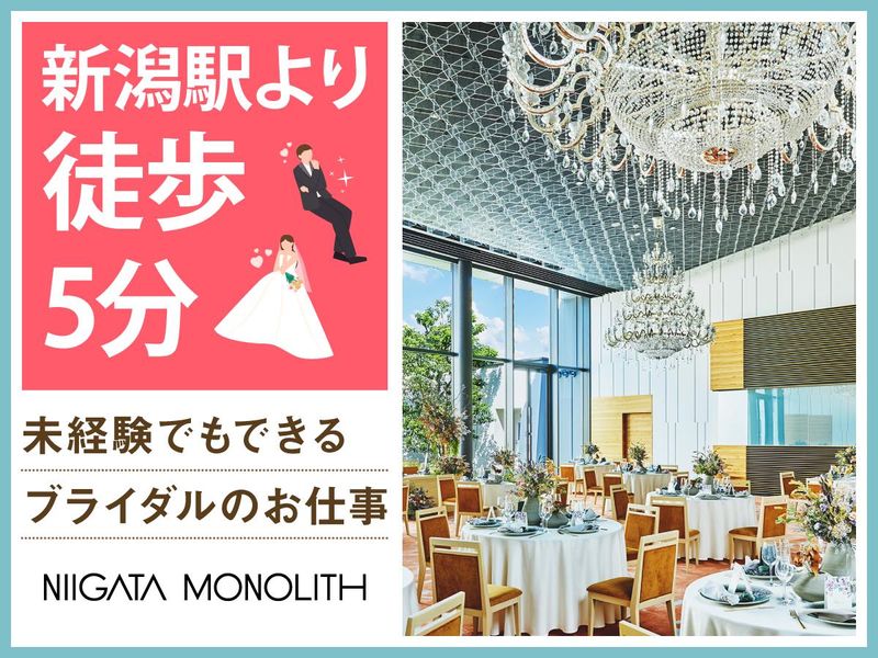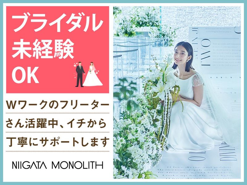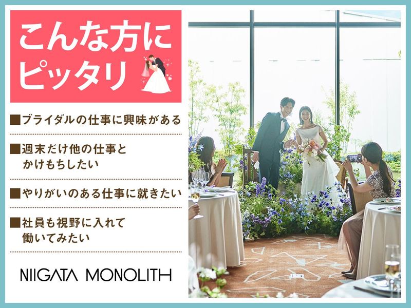 仕事内容 *現代建築の美空間が広がる結婚式場* 感動いっぱいの結婚式を一緒にサポート♪ 週1~の柔軟シフトでWワーク・副業OK! フリーターさんも活躍中♪ 「人が喜ぶ姿が好き」「サプライズが好き」 という方必見!スキルや経験は一切不要♪ 一緒に素敵な結婚式を演出しましょう* 新潟モノリスは 駅近に佇む現代建築で、 非日常的な美空間が広がる結婚式場。 ウェディングのお手伝いをするお仕事です◎ <主なお仕事内容は…> 結婚式場スタッフとして 次のお仕事をお任せ! ■会場の準備 ■お客様の上着や荷物のお預かり ■お席のご案内 ■結婚式のお料理・ドリンク提供 ―――――――――――――――― かけもち・Wワーク希望の方に オススメのポイントはこちら★★ ―――――――――――――――― ・週1日~1日5時間~OKで融通◎ ・本業が休みの土日だけ等大歓迎! ・かけもち・副業OK! ・絶品のまかないアリ(^^) まかないは本格料理人たちが 美味しい食材を使って作ってくれます♪♪ 現在アルバイトスタッフは25名在籍! 10代20代の方が多く、 和気あいあいとした雰囲気です。 中には社会人で 週末は新潟モノリスでバイト という方も。 男女比は2:8ですが、 男女問わずスタッフ募集中です! ―――――――――――――――― 特別な1日をサポートするお仕事 具体的な仕事の流れは? ―――――――――――――――― ▶STEP.1 ミーティング 披露宴の流れやお料理について スタッフ間で事前に確認して 式中にバタバタしないようにします◎ ▶▶STEP.2 披露宴会場の準備 お席に置く名札や ゲストの方に渡す引き出物を確認したり グラスを磨いたりして準備します。 ▶▶▶STEP.3 お客さまのお出迎え 荷物をお預かりし、 待合室でドリンクをお出しします! ▶▶▶▶STEP.4 ホール業務 お席にご案内し、順番にお料理や ドリンクを提供します◎ ―――――――――――――――― 未経験者歓迎! みんなで助け合う雰囲気です ―――――――――――――――― 最初は結婚式の見学からスタート! 見学後は本番じゃないところで、 研修を実施します◎ 「ブライダルは初めて」 「マナーが少し不安…」 そんな方もご安心ください。 不安がなくなるまで、 スタッフ全員でサポートします◎