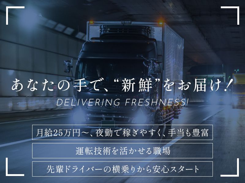 アピールポイント \頑張りは給与で還元/ ✅未経験スタートでも給与は25万~ ✅勤続年数に応じた昇給あり ✅充実した手当も魅力 夜勤がメインなので給与は高水準。 ガッツリ稼ぎたい方におすすめです。 また、無事故手当や家族手当など 福利厚生も充実しています。 \未経験でも安心スタート/ ✅最初は先輩の横乗りからスタート ✅免許取得時には費用を一部負担! 先輩社員が約1ヶ月付き添いで 丁寧に指導します。 大型免許取得の際には 費用の半額を会社が負担します! もちろん経験者やスキルをお持ちの方も 大歓迎です! \自由な社風が魅力/ ✅髪型・髪色自由 ✅服装自由 ✅ひげ・ピアスOK ✅時短勤務OK(要相談) 自由度の高い働き方ができるので 定着率も〇