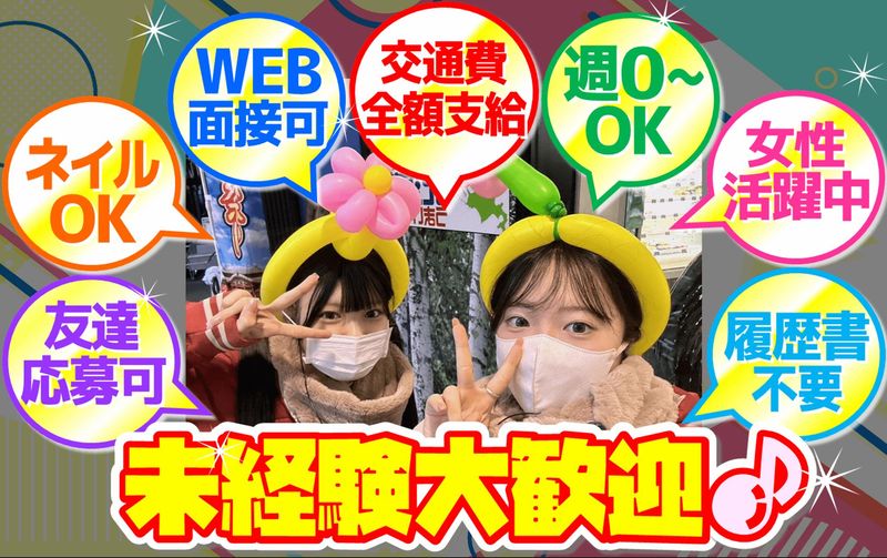 求めている人材 ◆高卒以上 ※進路決定済み高校3年生も応募可 《こんな方におすすめ♪》 ▼1つでも当てはまる方は大歓迎♪ □元気・笑顔に自信がある方 □声が大きい方 □個性を生かしたい方 □稼ぎたい方 □成長を実感したい方 □人と違うことをやってみたい方 □芸事やサービス業界で働きたい方 □社会人マナーを身につけたい方 □表現力・対話力・対応力を付けたい方 □ガクチカを見つけたい方 元気で明るい対応が出来ればOK☆ 10~20代の学生・フリーターの女性活躍中★ 声優・アイドルなど夢追い人が多数在籍♪ イベントのお仕事なので、 とにかく元気に真面目に…ふざけてください(笑) 笑顔で笑顔を作っていきましょう! ◆可愛い衣装を着てバルーンアートを作ったりお子様の相手をしたり、自分も楽しみながらお客様を楽しませてください♪ ◆抽選会は似たような内容なので、 毎回やることが変わることはありません。 ◆同世代のスタッフ達と楽しく働けます!