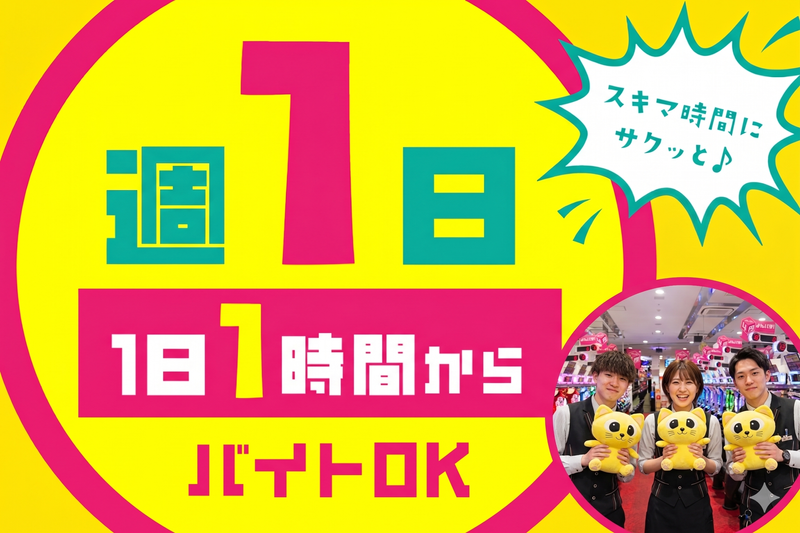 仕事内容 ******************** お試しで短期からのスタートOK! 週1日~、1日1時間~OK! 未経験でもしっかり稼げる高時給◎ 時給1400円スタート♪ 重たい物を運ぶ作業は一切ナシ 負担ゼロで始められます! ******************** < お 仕 事 内 容 > ■カウンターで、景品の交換対応 ■ホール内で、接客業務や簡単なお掃除 ■覚えやすいシンプルな お仕事ばかりなので、 未経験スタートの方でも安心です! ~~・ このお仕事のメリットは? ・~~ *休憩室にはテレビや電子レンジ、 エアコンも完備しているので、 休憩時間も快適に過ごせます♪ *フロア内も最新の空調設備を 完備しているので1年中快適に 過ごせます! *パチンコ玉の入った箱を 持つ必要もナシ! 重い物は一切持たないので、 負担ナシで働けます! *希望により月2回まで 稼働分の前払いも可能! *プライベート優先で働ける◎ 週1日、1日1h~勤務OK! ~~・ 当社について ・~~ 創業30年の当社は、 東日本を中心に15店舗を展開しております。 安定した基盤のもと、 店舗環境の整備と平行して 社員の働きやすい環境づくりにも注力。 接客業未経験の方も、 この機会にぜひご応募ください。