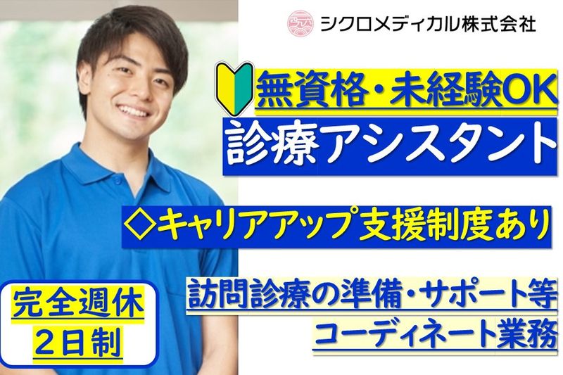 【仕事内容】 訪問診療の準備やサポートなどコーディネートを行う、診療アシスタントのスタッフ募集! 医師とチームを組み、患者様やご家族と診療所の橋渡し役としてニーズに寄り添い、安心して在宅療養生活を送って頂くためのサポートするお仕事です。 ドクター1人とアシスタント1名の2名で同行します。 ◎面接・ご入社時期について ・面接日のご希望ご相談に応じます。 ・ご入社時期ご相談に応じます。(早めのご入社も可能です。随時研修開始いたします。) ※内定が採用予定人数になり次第、募集を終了いたしますので、お早めにご応募ください。 ◎ポイント ・無資格・未経験OK! ・完全週休2日制!夏・冬長期休みあり! ・丁寧な研修(3ヶ月は同行によるOJTでの研修メイン) ◎コミュニケーションが活かせるお仕事 ・クラーク経験者の方特に歓迎! ・MR(医薬情報担当者)、MS(医薬品卸販売担当者)の経験者歓迎! ・接客・サービス業・営業などの経験者歓迎! ・医療ソーシャルワーカーや介護・相談員の経験者歓迎! ※新卒・第二新卒も歓迎です! ■詳しい仕事内容 当社がパートナー契約をしている在宅クリニック(みんなの在宅クリニック)での診療アシスタント業務 ●医師と患者様のもとに伺い診療をバックアップ(1日5~10件の施設訪問) 現地への車の送迎や、体温や血圧測定のサポートから医師がすぐに診察できるように使用する医療器具の準備等をお願いします。 診療中の会話内容を電子カルテに記録したり、診療レポートの作成をしたり、医師が診療に専念できるようサポートします。 医療知識や経験が無くても、しっかりと研修もあるので安心です。 ●患者様やご家族の相談対応 「症状が日々変化する中で、どうやって自分らしく過ごすか」を患者様やご家族と一緒に考え、意思決定を行います。 患者様やご家族は、ご自身の希望や不安をうまく言葉にできないことが多いです。 対話を重ねる中で患者様やご家族の本音を汲み取り、希望に沿った生活環境を整えるお手伝いをします。 ●チームで環境調整 患者様やご家族とお話した内容を元に、医師やケアマネジャー、介護施設などの管理者・看護師・ヘルパー、病院の医療連携室等、 いろいろな方と連絡や調整など、柔軟性のある対応と関係構築が大切です。他職種と連携・協力しながら、 患者様が最期を迎えるまでの時間を、自分らしく過ごせるようサポートします。 ※メールの送受信、インターネットの閲覧など基本的なPC作業あります。 ■管理職候補・幹部候補としての採用 将来は、クリニックの運営管理・事業企画や戦略を担う事務長や、マネジャー・管理職・法人の幹部候補としてキャリアアップが目指せます。 ■勤務先 【一般社団法人拠 みんなの在宅クリニック 本院】〒461-0022 名古屋市東区 東大曽根町36-13 愛知県で初めての一般社団法人(非営利法人)運営による訪問診療を行う在宅クリニックです。 ■シクロメディカル株式会社について 訪問診療クリニックの開業を中心に訪問医療を地域で展開できるシステムを構築しています。 また、診療所向けに医療事務などのバックオフィス業務委託も請け負っています。 <事業内容> ・開業支援 ・運営支援 ・医療事務代行 ・夜間時間外対応 いきなりのご応募が不安な方は、まずはお問合せだけでもOKです! お気軽にご連絡くださいね。 ご応募・お電話お待ちしております。 【求人ID-SKR】