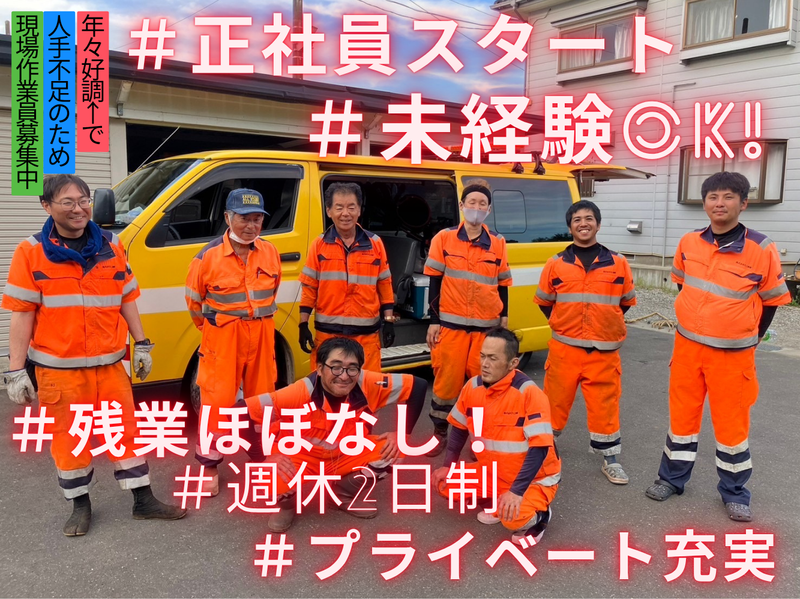 仕事内容 ▂▅▇ 正社員デビューを応援 ▇▅▂ 未経験でも安心の教育体制でお迎え✨ 地域に貢献しながら安定して働けるお仕事! ―――――――――――――――――――― ▼ 高速道路保全・維持作業スタッフ募集 ▼ ―――――――――――――――――――― ✅ 残業ほぼ無し! ✅ 週休2日+長期休暇=年休113日以上 ✅ 作業服一式貸与 & 洗濯は会社におまかせ! ╭━━━━━━━╮ お仕事内容 ╰━━━━━━━╯ 高速道路の保全・維持工事を中心に、 地域の交通インフラを支えるお仕事です。 安全で快適な道路環境を守るため、 以下のような作業を行っています。 ■ 清掃作業: 高速道路や周辺施設、排水溝の清掃 ■ 草刈・樹木伐採作業: 草刈・剪定・伐採 ■ 休憩施設の景観保守: お客様が気持ちよく使えるよう 環境を整備 ■ 補修作業: ・集水ます改良工 ・防草シート工 ・動物侵入対策工 ・コンクリートシール工 ・路面補修 …など 未経験の方も、まずは 草刈りなど簡単な作業からスタート! 先輩がペアになってOJTで しっかりサポートします。 ※各現場へは、 支店に集合してから全員で出発します。 ╭━━━━━━━━━╮ 1日の作業工程 ╰━━━━━━━━━╯ 時間 内容 08:00 事務所集合 (ラジオ体操・朝礼・ミーティング) 08:20 出発 08:50 現場到着・作業開始 12:00 昼食 16:30 事務所到着・片付け・翌日の準備 17:30 解散 「今日も1日お疲れさまでした✨」 ╭━━━━━━━━━━━━━━━━━╮ 働きやすさ&成長を応援する制度 ╰━━━━━━━━━━━━━━━━━╯ ✅【週休2日制】でプライベートも充実  ̄ ̄V ̄ ̄ ̄ ̄ ̄ ̄ ̄ ̄ ̄ ̄ ̄ ̄ ̄ ̄ ̄ ̄ 業界では珍しい週休2日制を導入。 「仕事も休みも大切に」 そんな想いから、しっかり働いて しっかり休める環境を整えています。 家族との時間や趣味の時間も確保できます✨ ✅【資格取得支援あり】全額会社負担!  ̄ ̄V ̄ ̄ ̄ ̄ ̄ ̄ ̄ ̄ ̄ ̄ ̄ ̄ ̄ ̄ ̄ ̄ スキルアップを目指すあなたを 当社は全力でサポート! <大型免許> ▶▶教習所費用・試験費用を全額会社負担 <施工管理技士> ▶▶受講料・交通費も会社が負担 その他、資格取得に関わる費用も 会社が支援します。 「学びたい」「成長したい」という 気持ちを応援します! ✅【自分の成長】キャリアアップ可能!  ̄ ̄V ̄ ̄ ̄ ̄ ̄ ̄ ̄ ̄ ̄ ̄ ̄ ̄ ̄ ̄ ̄ ̄ まずは現場で経験を積みながら、 資格取得やスキルアップを通じて ステップアップ! 将来的には管理職や施工管理職など、 キャリアの幅を広げるチャンスがあります。 長く安心して働ける キャリアパスが整っていますよ✨ ✅【スタッフ満足度"高"】充実の福利厚生  ̄ ̄V ̄ ̄ ̄ ̄ ̄ ̄ ̄ ̄ ̄ ̄ ̄ ̄ ̄ ̄ ̄ ̄ ̄ 社員一人ひとりが安心して働けるように、 快適な職場環境と サポート体制を整えています! ◆ 社員寮完備(茂原・山武) 遠方からの応募も安心! 生活の拠点として すぐにスタートできる環境です! ◆ 作業服一式貸与&洗濯は会社におまかせ! 常に清潔な作業服で 気持ちよくお仕事ができます。 会社が洗濯を対応するので、 毎日手間いらず♪ ◆ 男女別個人ロッカー完備 ロッカーには洗濯済みの 作業着がセット済み! 出社後すぐに着替えて、 スムーズに作業を始められます! ◆ シャワー室複数完備 汗をかいても安心。 作業後はシャワーでリフレッシュして、 すっきり帰宅できます✨
