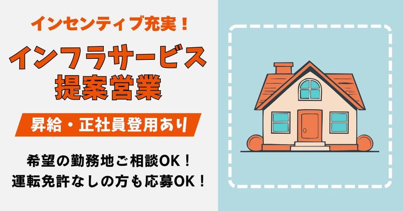 【仕事内容】 【仕事内容】 戸建やマンションの居住者、管理会社・店舗法人のお客様に、テレビ・ネット・電話・モバイル・電気・ガスなど複合メディアサービスをご案内&ご提案します。 「接客業しか経験がない」「人と話をするのが好き」「がっつり稼ぎたい」「成果を給与に反映してほしい」、そんな方にピッタリ。 また所属するエリアが限定されますが、運転免許なしでも◯ 営業職では必須が多いので、「免許はないけど、営業職に挑戦したい」そんな方は、ぜひこの機会に挑戦してください ※その他営業職以外にも事務職やカスタマーのポジションもございますので、ご相談ください。 【ここがポイント】 ・未経験スタート多数活躍中 ・接客業からのキャリアチェンジ可能! ・入社1年未満で月収30万円以上の実績多数あり ・タブレット、社用車、電動自転車貸与あり ・運転免許なしの方も応募OK! ・正社員登用あり ・キャリアアップ実績あり 入社後はしっかりとしたカリキュラムのOJTあり! 研修終了後もサポート体制万全のため、安心してお仕事をスタートいただけます。 【就業場所】 東京都内各エリア(港・新宿・杉並・中野・武蔵野・三鷹・多摩・八王子・日野・調布・大田・世田谷・江戸川・板橋・北・足立・すみだ・台東 など) 神奈川・千葉・埼玉の拠点もあり。ご自宅近くや希望の勤務地ご相談OKです。 【魅力ポイント】 【ここがポイント】 ・未経験スタート多数活躍中 ・接客業からのキャリアチェンジ可能! ・入社1年未満で月収30万円以上の実績多数あり ・充実したOJT&サポート体制 ・タブレット、社用車、電動自転車貸与あり ・運転免許なしの方も応募OK! ・正社員登用あり ・キャリアアップ実績あり 【求人ID-TKY01】