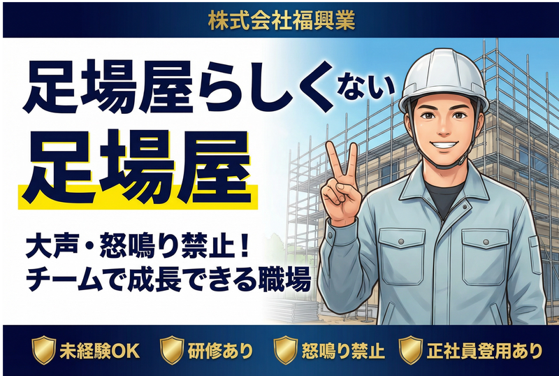 アピールポイント: 当社は怒ったり、大声を出すことは禁止しています! 足場屋らしくない足場屋です♪ 未経験でできないことは当たり前です! まずはできることから始めていきましょう♪