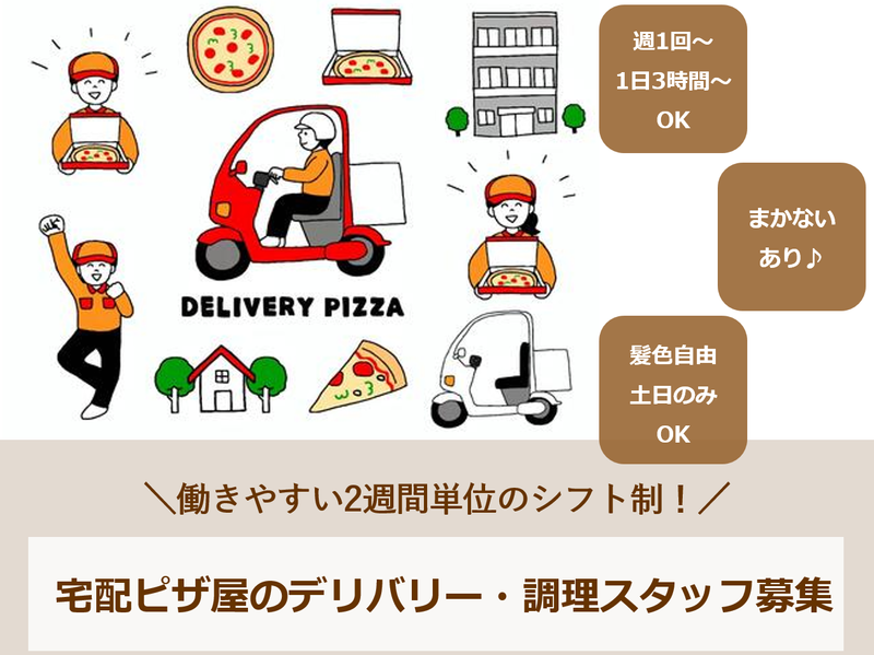 仕事内容 *~*~*~*~*~*~*~*~*~* ✅未経験OK!難しい作業はなし! ✅柔軟なシフトで働きやすい♪ ✅主婦さん、学生さんも大歓迎◎ ✅デリバリー希望の方は原付免許もしくは普通運転免許をお持ちの方募集★ *~*~*~*~*~*~*~*~*~* <お仕事内容>  ̄ ̄ ̄ ̄ ̄ ̄ ̄ ̄ ̄ ̄ ̄ ̄ ̄ ̄ ̄ ̄ ̄ ̄ ̄ 宅配ピザ屋のピザやパスタの お届け・調理をお任せします! ◆調理 ◆配達 ◆簡単な店舗業務 └配達準備や片付けなど <安心ポイント>  ̄ ̄ ̄ ̄ ̄ ̄ ̄ ̄ ̄ ̄ ̄ ̄ ̄ ̄ ̄ ̄ ̄ ̄ ̄ ⭐未経験でも安心してスタートできるよう、 先輩スタッフがしっかりサポートします。 難しい作業はなく、ほとんどの方が すぐに業務を覚えられる環境です。 ⭐シフトの柔軟性 シフトは2週間単位で調整可能! 「土日のみ」「夕方から」など、 ライフスタイルに合わせた働き方が可能! テスト期間中のお休みも相談可能なので、 学生の方にもおすすめです。 ⭐デリバリー希望の方 原付免許もしくは普通運転免許があればOK!