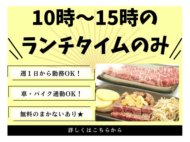 職場環境 << ⏩こんなお店です!! >> 本格的なステーキレストラン まかないも無料! 主婦多数活躍中! シフトなども融通しますので お気軽にご相談下さい⭐ 「ここを選んで良かった」 みんなの声が嬉しい職場です! 丁寧な研修とマニュアルあり◎