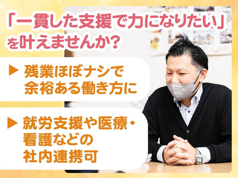 【保険制度】 雇用保険、労災保険、健康保険、厚生年金 待遇・福利厚生 【福利厚生】 ◇交通費規定内支給 ◇研修費用負担(規定あり) ◇資格取得支援制度 (会社指定資格は全額補助) ◇推薦図書貸出制度 ◇副業可 ◇キャリアコース選択制度 ◇メンター制度 ◇社内転職制度 ◇社内公募制度 ◇FA制度(選択型人事制度) ◇クルー紹介制度 ◇退職金制度(5年勤続者が対象) ◇職場相談窓口完備 ◇健康診断 ◇インフルエンザ予防接種補助制度 ✨【社内研修制度も充実】✨ ✅新入社員オリエンテーション 入社後3か月以内に集合研修を実施。 全事業の中途入社新入社員を対象とし、 社長自らが経営方針や創業経緯などを 対面で研修をいたします。 ✅D-learning研修 全4講座(Philosophy講座、ビジネス講座、専門講座、マネジメント講座) 別に全420以上の e-learningを用意しています。 未経験の方でも安心して学習を 詰めるよう、業務に必要な基礎的な 支援スキル・障害特性・保険制度 まで幅広い研修をご用意。 就業時間内での受講を推奨 しているので、業務時間内の 空き時間に自身のペースで 学習を進めることが可能です。 ✅階層別研修 全5階層に分けて必要な ポータブルスキルの習得を 目指していただきます。 管理職や管理職を目指す方は、 ・組織マネジメント理論 ・労務 ・財務 ・経営戦略 など役職に応じた研修を 実施しています。 ✨【キャリアコース制度あり】✨ 支援スキル向上を目指す 「プロフェッショナルコース」と、 管理職として組織運営に チャレンジする 「マネジメントコース」から ご希望に応じて 選択することができます。 未経験の方は、まずは ベーシックコースからスタート。 実際に業務を行ってみて、 自身の適性と志向から、 将来のキャリアを選択頂けますよ!