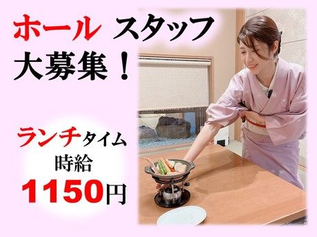 仕事内容 ホールパートナー ・開店準備(勤務時間によってあり) ・ランチホール業務 ・お出迎え ・オーダー ・お料理提供 などをお願いします。 着付けからオーダー取りまで、先輩スタッフがしっかり指導します★ ★ランチ勤務の一日の流れ 10:30⇒出勤!着物に着替えて準備 11:00⇒ご家族連れのお客様のほか、お祝いや接待として利用されることも。 15:00⇒片付けを行い退勤または休憩 そのままディナー勤務することも可能です♪
