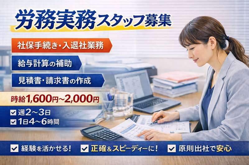 仕事内容 【即戦力の労務実務スタッフ募集】 労務経験3年以上/時給1,600円〜2,000円/週2〜3日・4〜6時間 ■ 募集背景 イベント運営会社にて、 労務実務を自走できる即戦力の方を募集しています。 社保・入退社手続きを中心に、正確かつスピーディーに対応いただける方を求めています。 ■ 仕事内容 労務実務を中心にお任せします。 【メイン業務】 社会保険・雇用保険手続き(入退社・変更等) 入退社に伴う書類作成・管理 労務関連書類の管理・整備 【サブ業務】 勤怠データ確認(勤怠管理ソフト:e心伝心) 給与計算補助(マネーフォワード使用/最終確認あり) 見積書・請求書の作成 ※実務の正確性・処理スピードを重視します ※すべての業務を必須とするわけではありません ■ 応募資格【必須】 労務実務経験3年以上 社会保険・雇用保険手続きを一通り対応した経験 正確性とスピードを両立できる方 基本的なPC操作(Excel・メール) ■ 歓迎スキル(評価対象) マネーフォワードでの給与計算経験 勤怠管理ソフト(e心伝心等)の使用経験 中小企業での労務実務経験 見積書・請求書作成の実務経験 ■ 雇用形態 パート・アルバイト ■ 勤務条件 週2〜3日 1日4〜6時間 勤務曜日・時間帯は相談可 ■ 勤務地 東京都世田谷区用賀 ※原則出社 ■ 給与 時給 1,600円〜2,000円 ■ 待遇・福利厚生 交通費支給(規定あり) 社会保険(加入条件を満たした場合) 服装自由 ■ こんな方を求めています 労務業務を「指示待ち」ではなく進められる方 処理スピードと正確性に自信のある方 少人数環境で柔軟に対応できる方