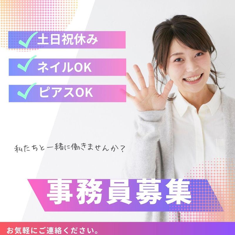 求めている人材 【必須】 ◇普通自動車運転免許 ◇エクセル・ワードを使える方 【優遇】 ◇事務の経験をお持ちの方 【歓迎】 ◇ブランクOK! ◇未経験の方 ◇正社員で働きたい方 ◇明るい職場で働きたい方 ◇新しいことに挑戦したい方