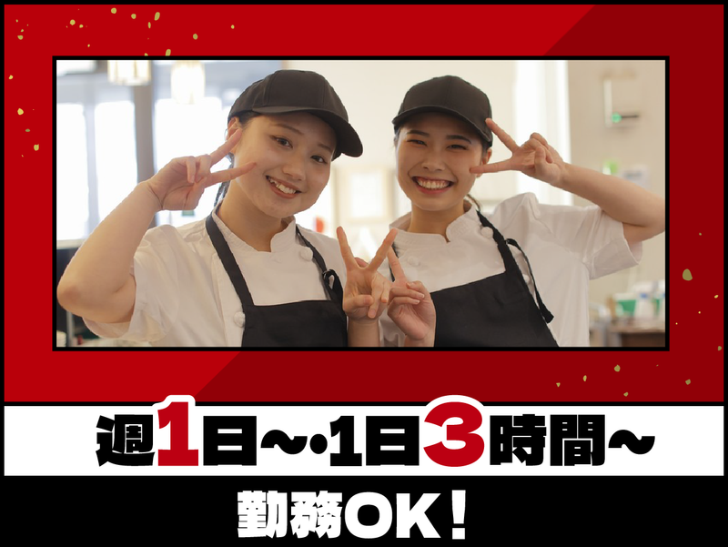 仕事内容: / ランチ帯のホール・キッチンスタッフ! \ ホールなら… ■お席へのご案内・オーダー伺い ■お料理やドリンクのご提供 ■慣れてきたらお会計(レジ)業務 などをお任せ! キッチンなら… ■お肉や野菜のカット・盛り付け ■一品料理の簡単な調理 ■ドリンクづくり などをお任せ! ※難しい調理は一切ありません◎ //////////////////////////////////////// 電話でのお問い合わせは <0570-057-087>までお気軽にどうぞ♪ //////////////////////////////////////// / お仕事復帰・久しぶりのパート大歓迎! \ 家事や育児の合間に働く主婦(夫)さんが多数活躍中! ■わかりやすいマニュアル完備 ■先輩や社員からの丁寧な研修あり あなたのペースに合わせて優しくサポートするので、焦らず少しずつ覚えていけますよ♪ / 自由度バツグン! シフトの融通◎ \ ■週1日~、1日3h~OK! ■平日のみ/土日祝のみOK ■短時間サクッと/フルタイムでガッツリも◎ 自分の都合に合わせて働けるから、 家事や子育てとの両立も抜群です! / ただのバイトじゃない! 成長できる環境 \ 私たちは「ひとつ上の食べ放題」をコンセプトに お客様に幸せな時間を過ごしていただくための取り組みを 社員だけではなく、パート・アルバイトのみなさんも一緒になって真剣に考えています。 一生モノの気配りや調理スキルはもちろん、同世代の仲間との絆や達成感など、 ここでしか得られない「自分の成長」を実感できる環境です! 【雇用形態】 アルバイト・パート 【期間】 長期で勤務できる方大歓迎!